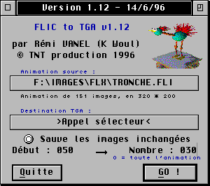 | But | Créer une suite d'images au format TGA (24 bits) à partir d'un fichier animation FLI ou FLC (compatible Apex). |